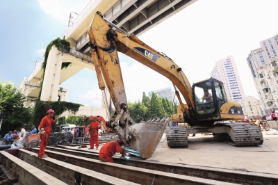 图为工地的工作人员在高温下坚持作业。 沈春琛 文 袁杰 摄