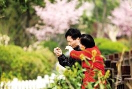 粉色桃花、白色玉兰花、黄色迎春花,花姿百态、姹紫嫣红。蔚蓝的天空下,碧水环绕、波光粼粼,映衬着人们的笑脸。漫步河畔,俨然置身于一幅美景中,市民不禁驻足拍照,记录下这满园春色。