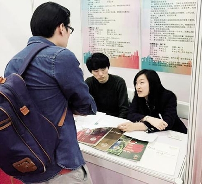 2015年4月21日下午,“帮人才就业,促民企发展”民营企业招聘周虹口专场活动在上海财经大学体育馆举行,区人大代表所在11家企业,提供了158个涉及城市建设、营销、财务、组织人事、医药、会计等工作岗位。图为区人大代表张富林所在的中昆投资(集团)有限公司招聘现场。