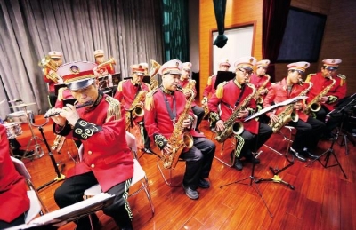 图为“春天的旋律”曲阳社区管乐队加紧排练。