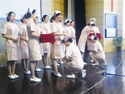 为进一步弘扬护理人员的先进事迹,展示新时代护理工作者的风采,区卫生系统还开展了“最美护士”评选活动,最终12名护士获得该称号。图为护士授帽仪式。张雯珵 摄