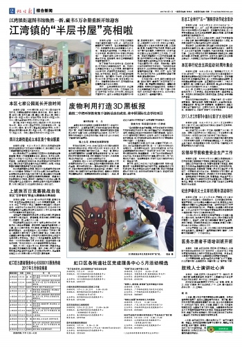 除了丰富多彩的活动内容,经过修缮后,图书馆的内部面貌也焕然一新。现在的江湾镇图书馆分为上下两层,建筑面积有1000平方米,设有报刊图书阅览区、少儿阅览区、电子阅览区、自修区、多功能活动室等服务场所。馆内藏书5万余册,订阅各类期刊160多种、报刊近60种,有阅览席位200多个。随着硬件条件的升级,图书馆服务社区居民的能力也大大提升。
