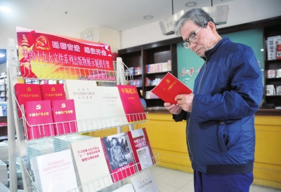 日前,党的十九大文件系列出版物在新华书店各门店上架销售。在新华书店四平路店,不仅购买十九大报告单行本和党章的团购订单不断,而且店内的十九大文件系列出版物展销专架也吸引了大量顾客购买阅读。