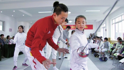 活动邀请上海击剑队领队、中国首位现代五项世界冠军钱震华,女子重剑世界冠军仲维萍,天津全运会男子重剑个人金牌得主张成杰,男子佩剑团体冠军刘星宇以及上海击剑队优秀运动员们走进校园,与继光初级中学和虹口区第二中心小学的击剑小队员们开展互动交流。在“我跟冠军一起练”“敢拼你就来”等环节,击剑队运动员现场指导学生做协调性游戏,并由小队员们向优秀运动员们发起挑战,大小队员们的精彩表现激起了现场观众的叫好和掌声。图为击剑运动员指导学生做剑术动作。