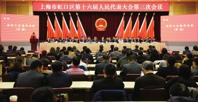 下午4点,吴延风宣布上海市虹口区第十六届人民代表大会第三次会议开幕,全体起立,奏唱国歌。大会应到代表279名,实到代表225名,符合法定人数。