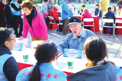 ⑸市供水管理处的摊位前,3位志愿者们向老人答疑解惑。