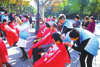 ⑴迫不及待想见见自己的新发型,让一旁的志愿者赶紧拍张照瞧瞧!理发,是最受大家喜爱的项目之一。