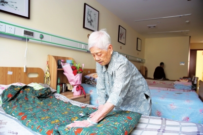 图为百岁老人赵妙娟正在整理自己的床铺。