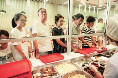 “谢谢哦。我脚不太好走路,你们每天送饭来真是解决了我一个大问题。”上午11点,家住曲阳路街道邮电二村的谭阿婆准时拿到了自己从社区食堂订的饭菜,透明饭盒中盛着一客饭、三样菜,荤素都有。
