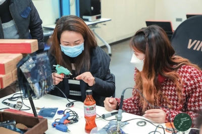 为了将设计愿景更好地付诸实践,研究院与“中国首家创客空间”新车间在活动期间共同设立了可进行多种材料加工和原型制作的实践工坊,吸引了百余位“零基础”观众现场体验PCB电路焊接,制作“设计寰宇”专属电子徽章,在创作中寻找快乐。
